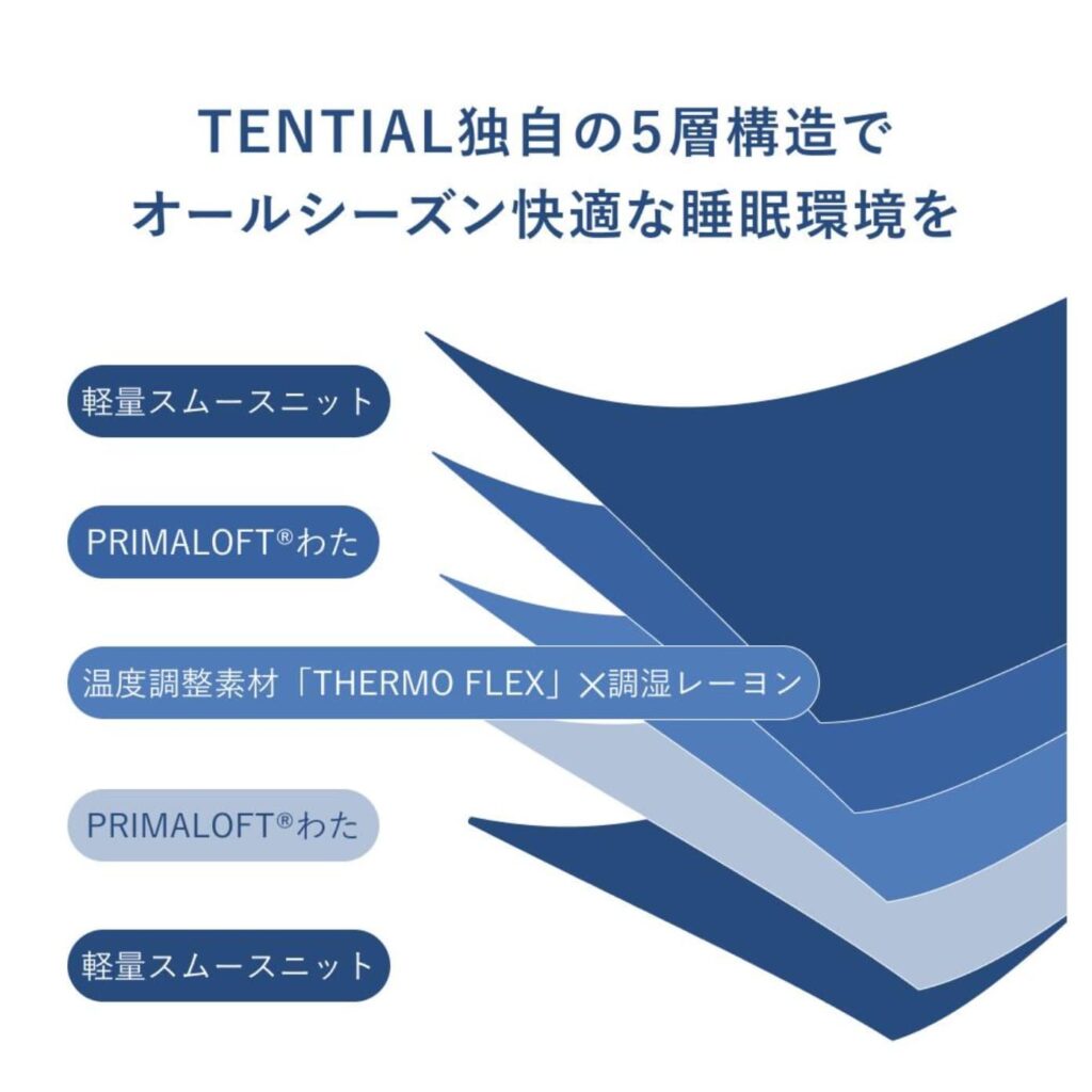 BAKUNE Comforter All Seasonsは、TENTIAL独自の5層構造で作られています。