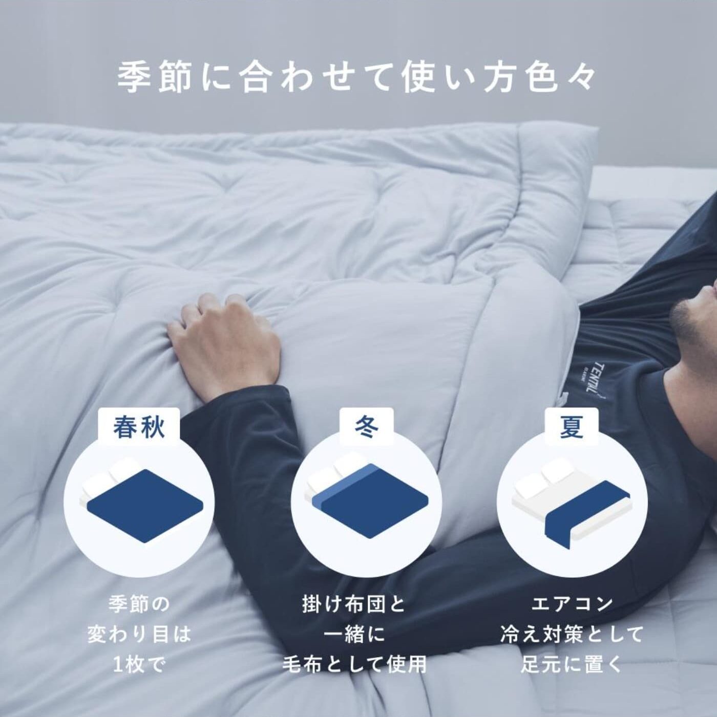 いっぱい掛けると重くて寝苦しいし、何枚も掛けるの面倒くさいから、重ねがけしなくていいのは助かる〜!