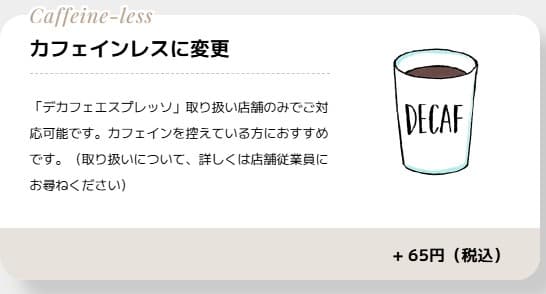 また、一部店舗で、エスプレッソドリンクを+65円(税込)で、デカフェに変更できます。