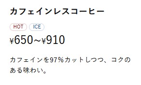 カフェインレスコーヒー(ホット・アイス)、カフェインレス・カフェ・オレ(ホット・アイス)があるようです。
