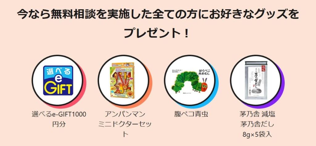 | ベビー プラネット ![]() ![]() 公式HP | アンパンマンミニドクターセット 絵本 選べるe-GIFT 茅乃舎だし | 妊娠・出産・子育てのタイミングで保険を見直したい人 子育てに理解のあるFPさんに相談したい人 |